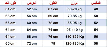 جدول المقاسات